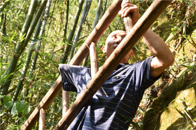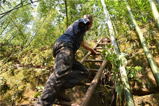 扛着约20斤重的木梯,独臂的刘青平沿着陡峭的山坡往上爬。在一处大石头前,将木梯倚靠在石壁上,刘青平单手抓住木梯爬上石头。他将上面的草拔掉,把竹叶清理干净,让横栽在石壁上的金钗石斛能够正常“呼吸”。