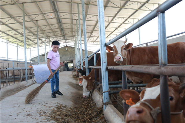 一走进养殖场,王华银就忙个不停。一会儿拿扫把清扫地面,一会儿拿铁铲给牛加草料。一听到牛叫,王华银就跑过去查看情况。