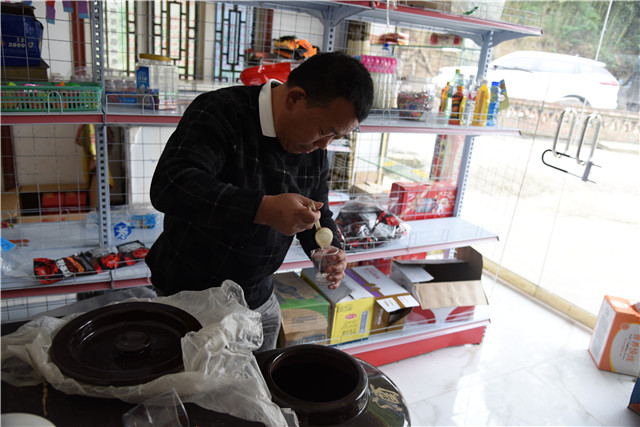 村民前来陈启刚家的小卖部买酒喝,陈启刚摸索着给村民打酒(2020年4月29日摄)。新华社记者 郑明鸿 摄