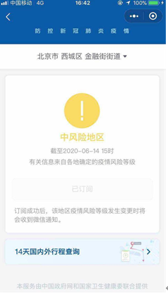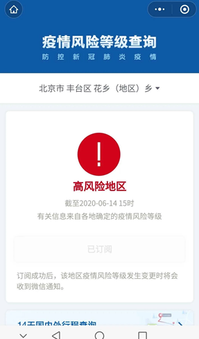 据国务院疫情风险等级查询小程序6月14日最新显示:北京市丰台区花乡地区升级为高风险地区,系新发地市场所在地。