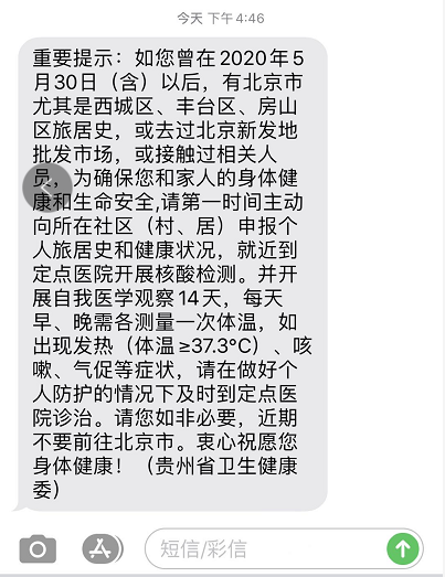 随着北京连续出现新增新冠肺炎感染病例,多个街道(乡)疫情风险等级相继提升为高级或中级,6月14日,贵州省卫健委通过短信向市民发出提示: