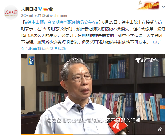 6月23日,钟南山院士在接受专访时表示,在“今冬明春”交际时,预计新冠肺炎疫情仍不会消失,但不会像第一波疫情出现这么大的暴发。必要时,短期的措施是需要的,如中小学停课、大学暂时不复课、航班减少这类短期措施,仍需采用强力措施控制病情不再发生。(来源:人民日报)