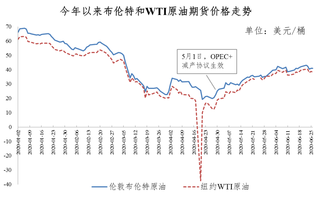 今年1—4月,新冠肺炎疫情全球暴发导致用油需求锐减、仓储库容极度短缺,国际油价大幅下跌至近二十年来低位。其中,4月20日纽约WTI原油5月合约临近交割前甚至跌至每桶-37.63美元的负值。极低油价给沙特、俄罗斯等主要产油国带来沉重压力,并促使各方达成新一轮历史性最大力度减产协议。随着5月OPEC+正式推进减产,美国等产油国在低油价下产量也出现下降,以及更多海外国家放宽疫情管制,需求预期得到改善,国际油价逐步回升。目前,伦敦布伦特和纽约WTI油价升至每桶41美元和39美元的水平。