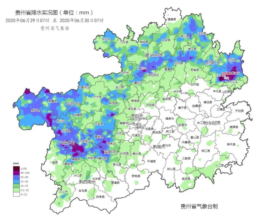 6月29日07时至30日07时,碧江区、江口县、晴隆域内6个观测站出现特大暴雨(最大为江口坝盘279.5毫米),碧江、德江、关岭、红花岗、汇川、松桃、江口、晴隆、印江、六枝、水城、威宁、西秀、沿河、镇宁、赫章、织金、普安、普定、七星关、绥阳、盘州、黔西23县(市、区)域内的71个观测站出现大暴雨,其中包含安顺市关岭自治县、西秀区、镇宁自治县、普定县4个县(区),35县域(市、区)内的254个观测站出现暴雨。强降雨主要集中在铜仁市中东部和北部、毕节市大部、遵义市中部、六盘水市北部和东部、安顺市中北部、黔西南州北部地区。