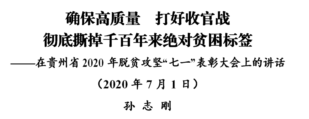 同志们!全面胜利,已经触手可及;千年追寻,圆梦就在今朝!今天是2020年7月1日,2020年至关重要、下半年更为重要。我们正处于“两个一百年”奋斗目标的历史交汇点,即将迎来完成光荣历史使命、迎接大考交上合格答卷的历史时刻,迎来人民期盼多年、摆脱贫困宿命的历史时刻,迎来贵州撕掉贫困标签、踏上现代化建设新征程的历史时刻!我们胜利在望、倍加自豪,我们责任重大、使命光荣,决不能丝毫松劲,决不能功亏一篑!必须一鼓作气、一战到底,继续奋战六个月,查缺补漏、巩固提升,确保高质量、打好收官战,彻底撕掉贵州千百年来绝对贫困标签!