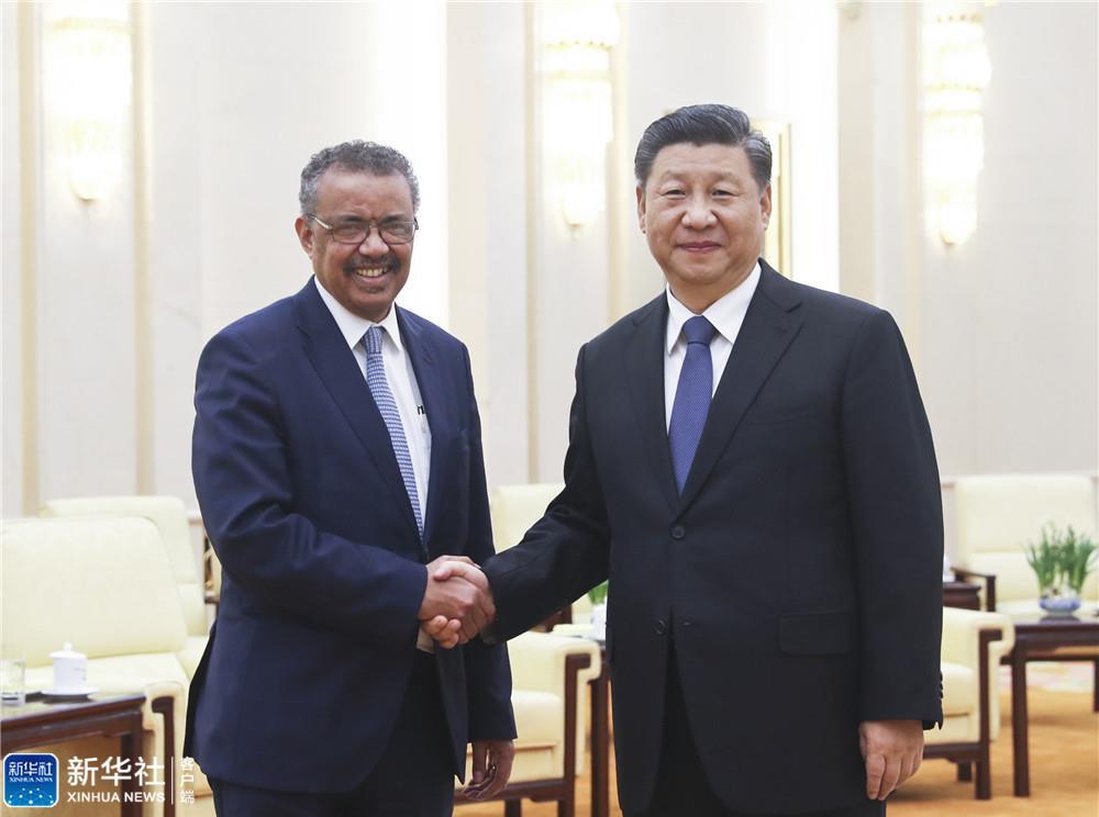 ↑1月28日,习近平在北京人民大会堂会见世界卫生组织总干事谭德塞。新华社记者 鞠鹏 摄