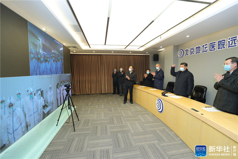 ↑2月10日,习近平在北京调研指导新冠肺炎疫情防控工作。这是习近平在首都医科大学附属北京地坛医院远程诊疗中心,通过视频连线武汉市收治新冠肺炎患者的金银潭医院、协和医院、火神山医院,了解情况、听取意见和建议,慰问一线医务工作者。新华社记者 鞠鹏 摄