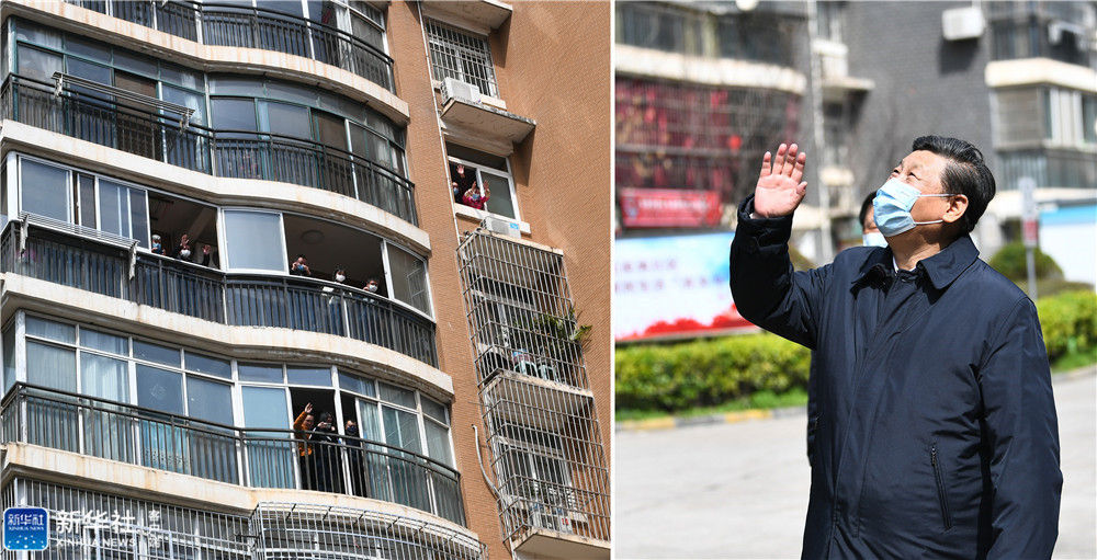 ↑3月10日,习近平专门赴湖北省武汉市考察新冠肺炎疫情防控工作。这是习近平在东湖新城社区考察时,向在家隔离居住的居民挥手致意、表示慰问(拼版照片)。新华社记者 谢环驰 摄