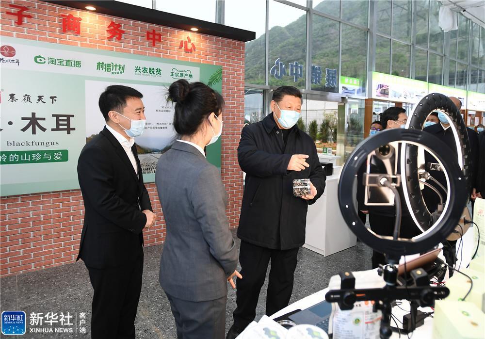 习近平来到陕西特困地区的核心区,勉励企业努力克服疫情带来的不利影响,积极拓展国内市场。他在金米村直播平台前“点赞”当地“小木耳、大产业”的视频风靡全网。据媒体报道,有2000万网友冲进淘宝,三个直播间同时开售,20多吨木耳都被卖光。习近平被网友亲切地称为“最强带货员”。