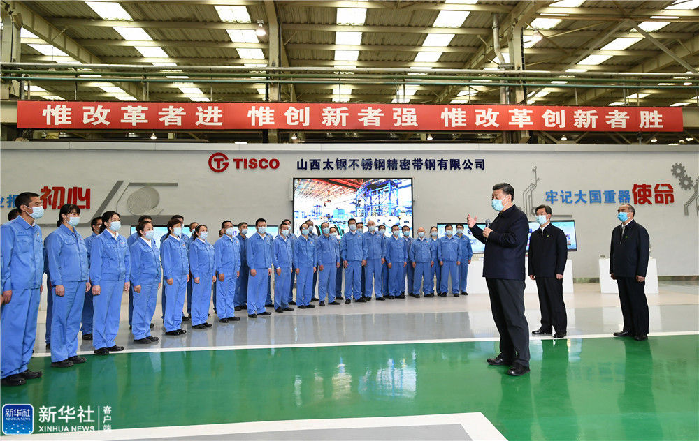 ↑5月11日至12日,习近平在山西考察。这是5月12日上午,习近平在太钢不锈钢精密带钢有限公司生产车间考察时,同企业职工亲切交流。新华社记者 谢环驰 摄