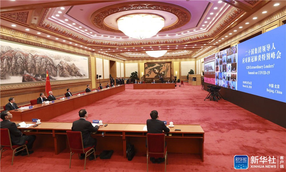 ↑3月26日晚,习近平在北京出席二十国集团领导人应对新冠肺炎特别峰会并发表题为《携手抗疫 共克时艰》的重要讲话。新华社记者 庞兴雷 摄