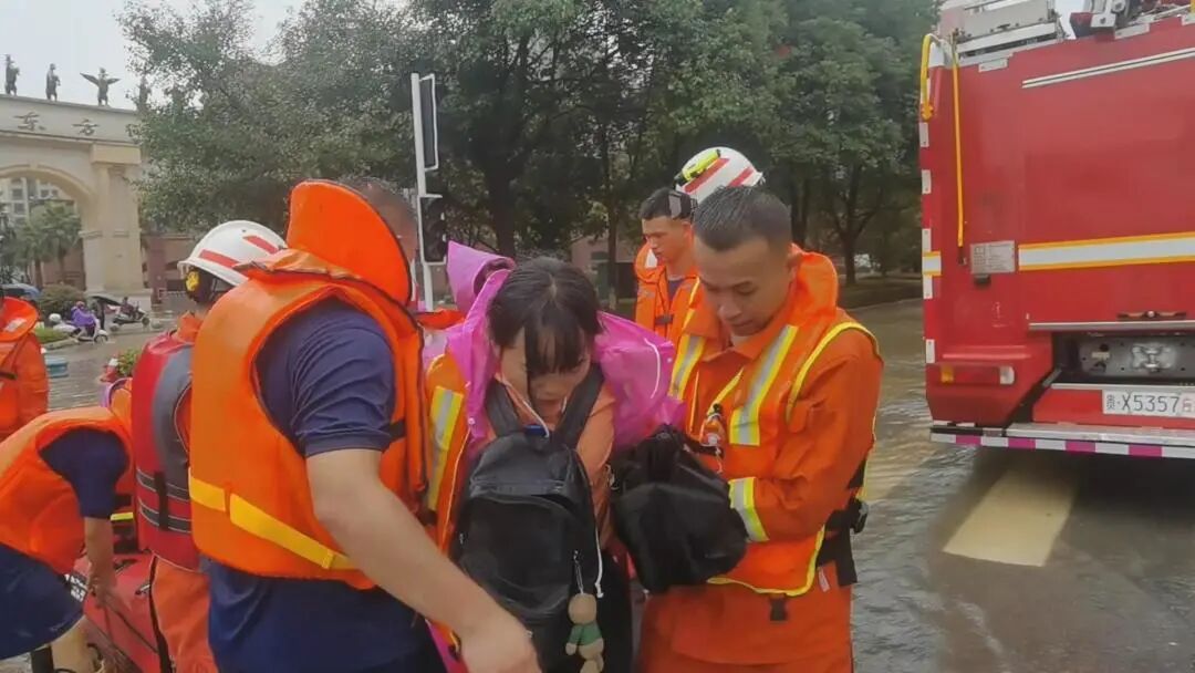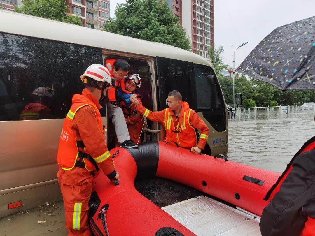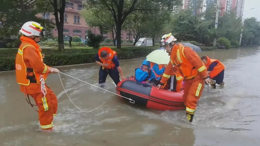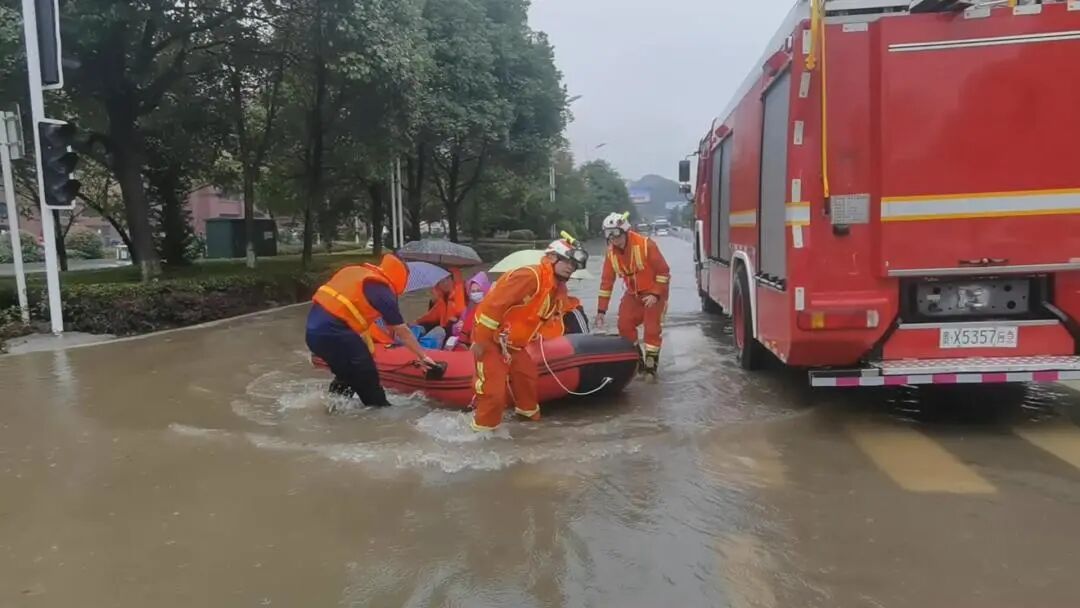 城市内涝 消防员雨中化身“纤夫”转移16名被困乘客