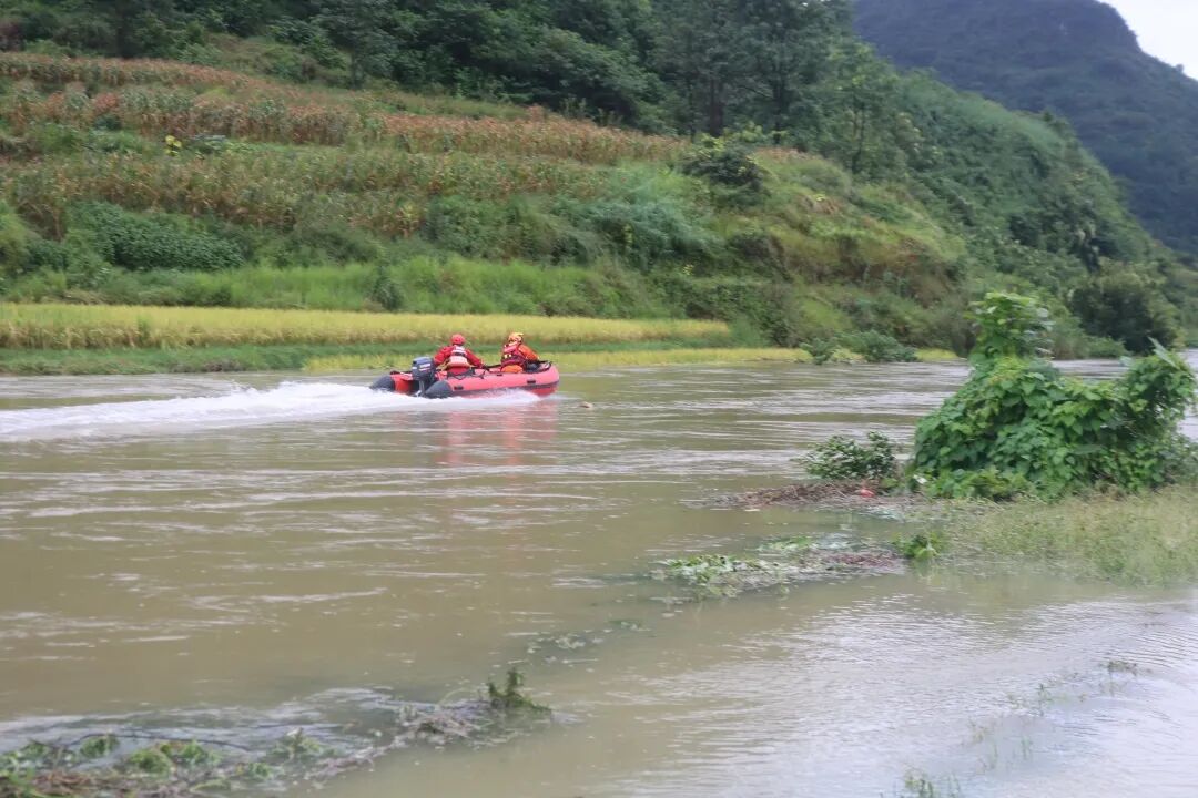 消防指战员抵达现场后,发现因近日持续降雨,导致黄果树大街东段道路严重积水,最深积水达1米,一辆载有16名乘客的中巴车陷在了道路中央无法移动,此时天还下雨,道路水位持续上涨,中巴车离安全位置还有约300米左右的距离。根据现场情况,消防指战员立即组成救援小组,带救生橡皮艇、专用救生衣、救援绳索等装备器材,前往中巴所处位置。为确保安全,消防指战员帮助车内乘客穿好救生衣,以腿为桥,分批次将乘客转移到橡皮艇上;随后,消防指战员化身“纤夫”,利用推、拉等方式,经过1个多小时的救援,成功将车上被困乘客全部转移至安全区域。
