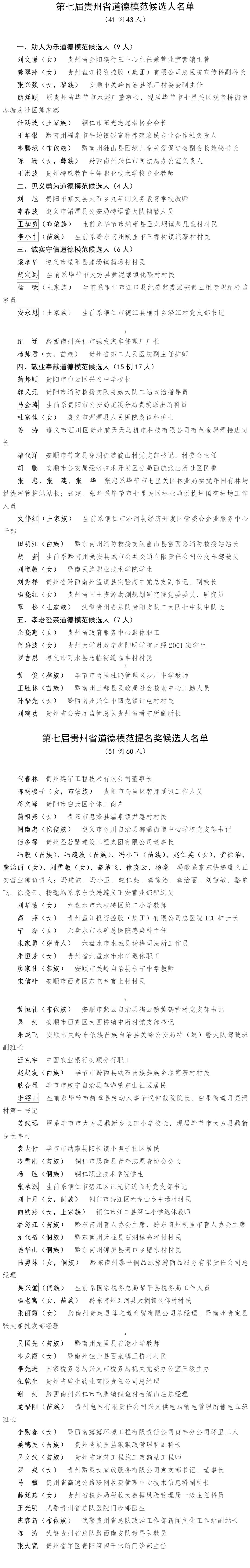 根据《关于开展第七届贵州省道德模范评选表彰活动的通知》(黔文明〔2020〕8号)要求,第七届贵州省道德模范评选工作小组按照评选程序和标准,对各地各相关单位推荐人选进行资格条件审核、评审会议审议、征求相关单位意见、再次核实候选人基本情况等程序,提出第七届贵州省道德模范候选人41例43人,提名奖候选人51例60人,现将名单予以公示,接受社会监督。公示时间为10月23日至29日。