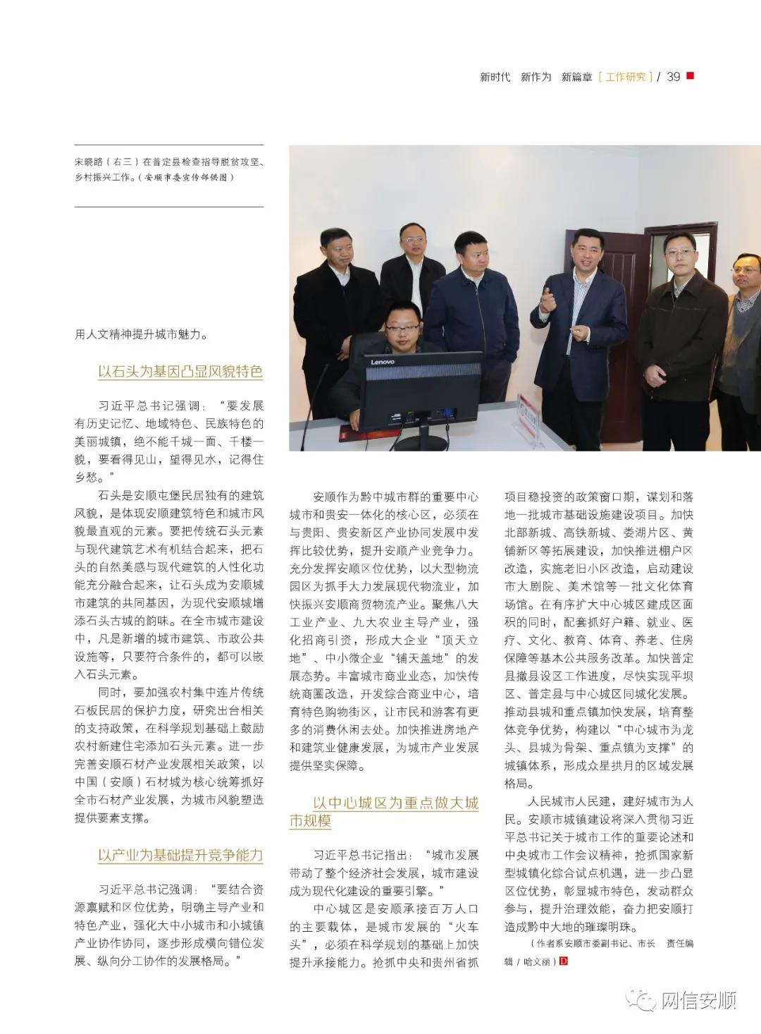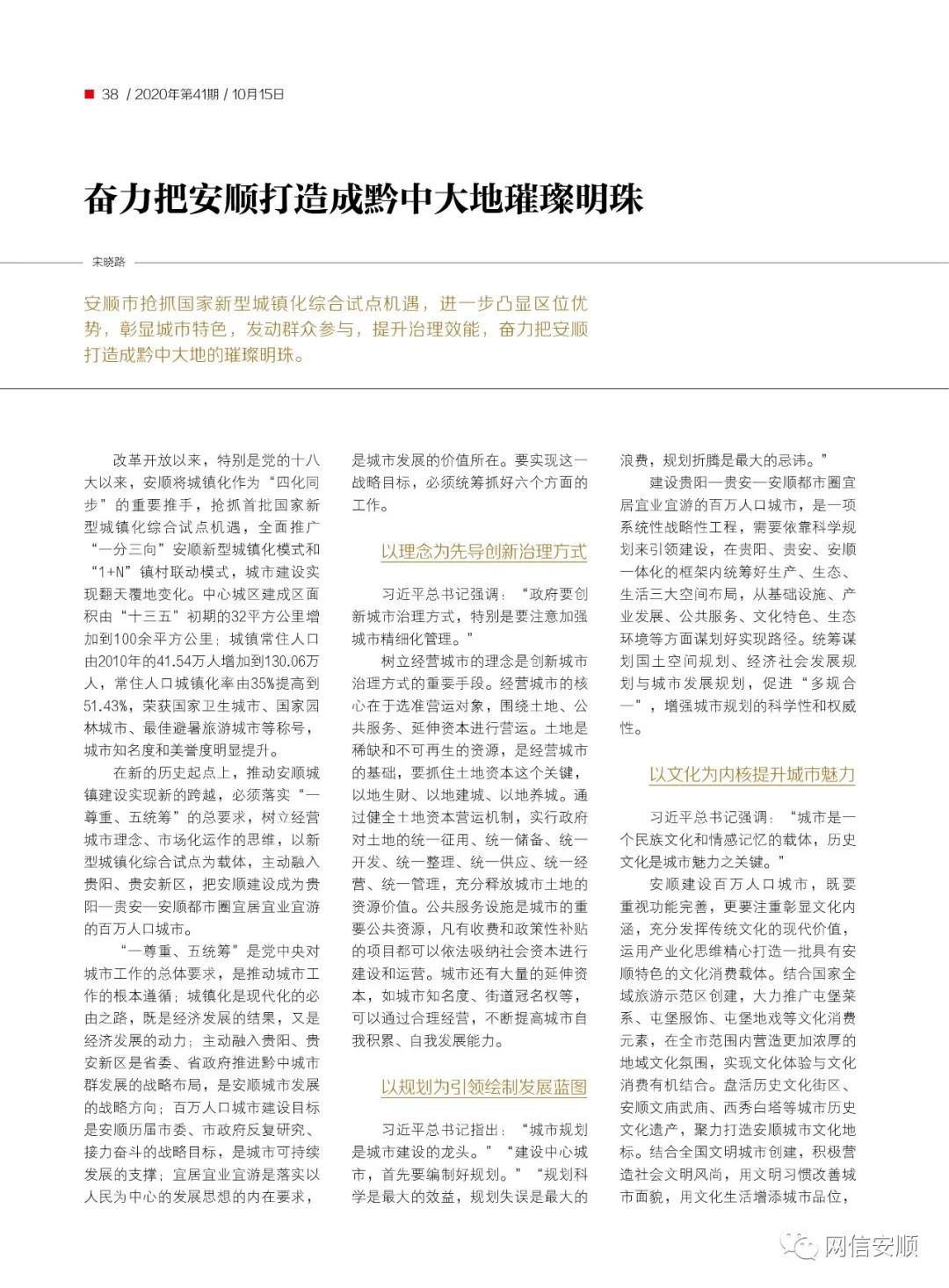 10月15日,当代贵州杂志刊发安顺市委副书记、市长宋晓路署名文章《奋力把安顺打造成黔中大地的璀璨明珠》