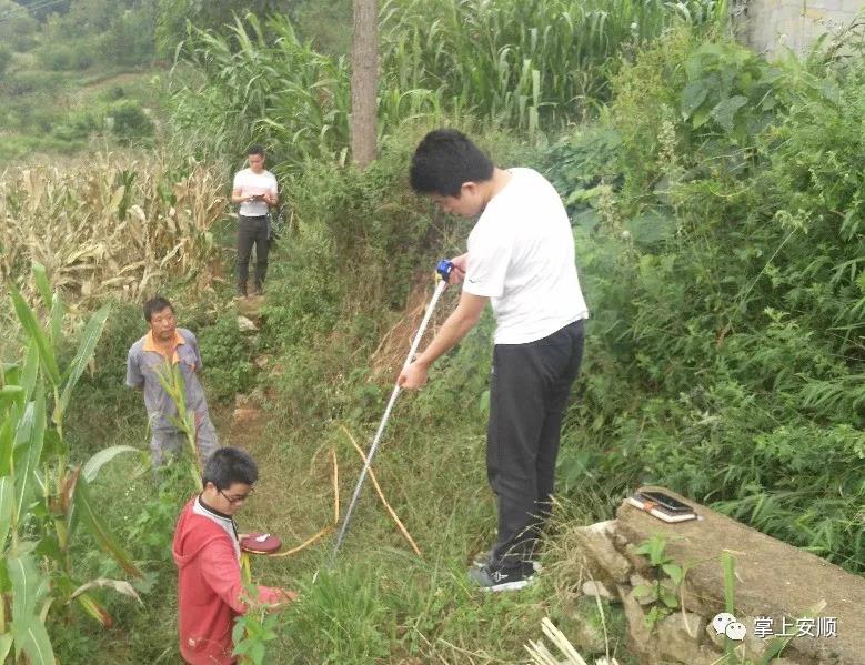 胡鑫(右一)与村干部测量需要修建、维修的水渠