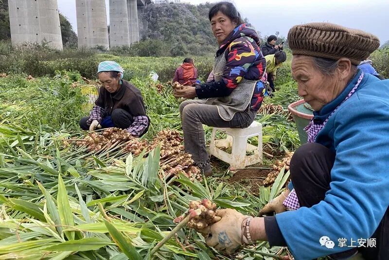 “镇宁小黄姜”种植基地,姜农们拔姜块、抖泥土、砍姜秸、套装带,忙得热火朝天