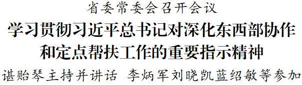 4月22日,省委常委会召开会议,学习贯彻习近平总书记对深化东西部协作和定点帮扶工作的重要指示精神及全国推进会精神,学习贯彻习近平总书记对职业教育工作的重要指示精神和李克强总理重要批示精神以及全国职业教育工作会议精神,学习贯彻郭声琨同志在我省考察调研时的讲话精神、全国县乡两级人大换届选举工作部署会议精神,通报广东省党政代表团到我省考察对接东西部协作工作情况,研究部署相关工作。