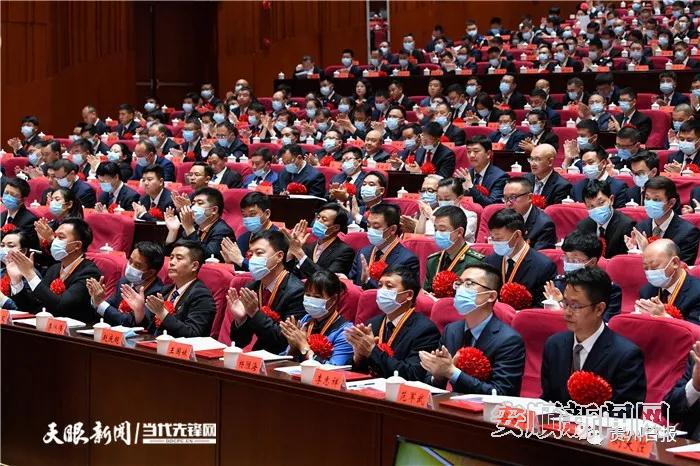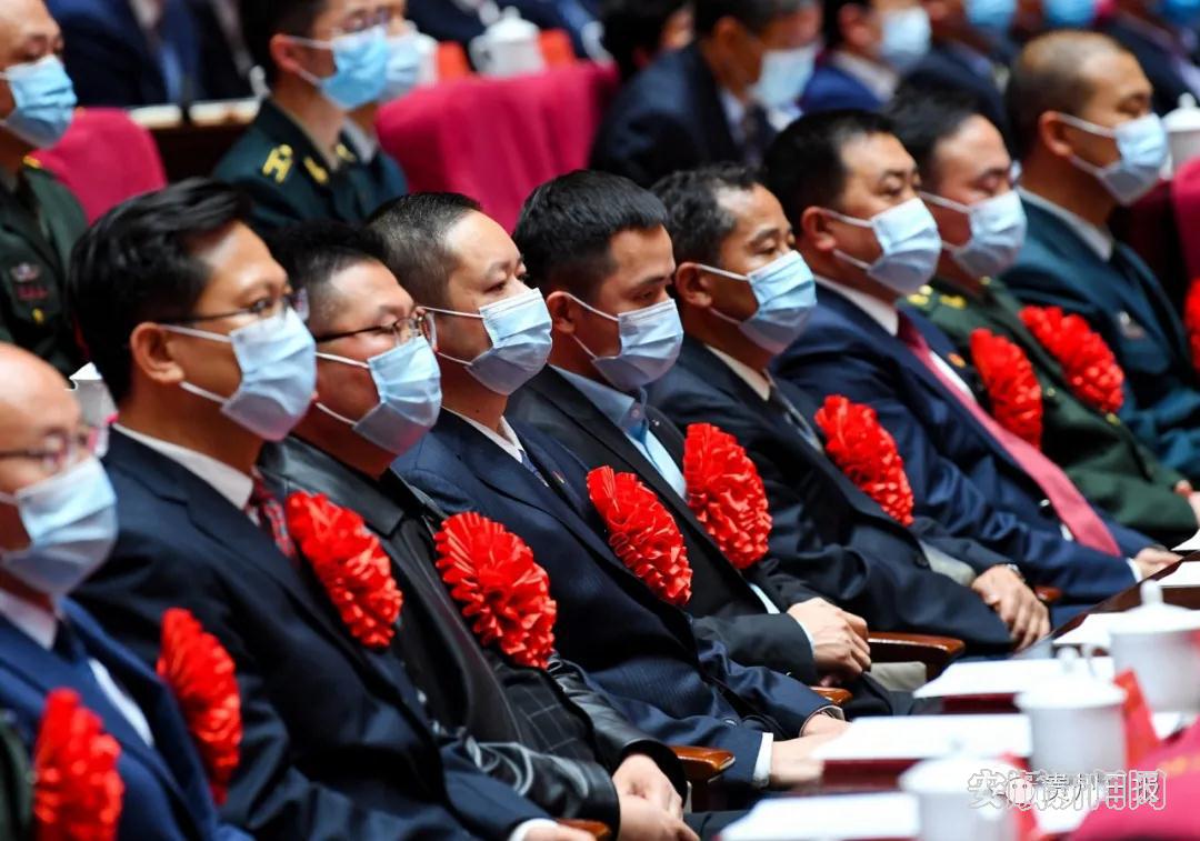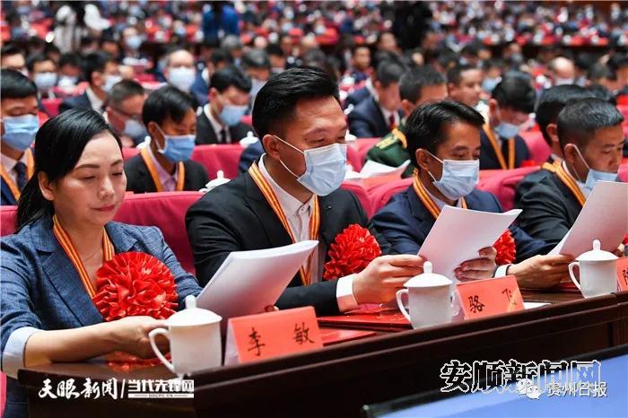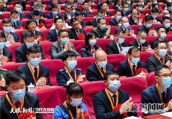 会场内气氛隆重热烈,两侧大屏幕上“向先进学习 向模范致敬”金色大字格外醒目。上午10时许,大会开始。雄壮的《义勇军进行曲》响彻会场,全场起立高唱国歌。随后,蓝绍敏宣读了《中共贵州省委 贵州省人民政府关于表彰全省脱贫攻坚先进集体和先进个人的决定》,决定授予贵阳市委办公厅等1000个集体“贵州省脱贫攻坚先进集体”称号,授予刘明兰等1500名同志“贵州省脱贫攻坚先进个人”称号。谌贻琴、李炳军、刘晓凯、蓝绍敏等省领导为受表彰的先进个人和先进集体代表颁奖。