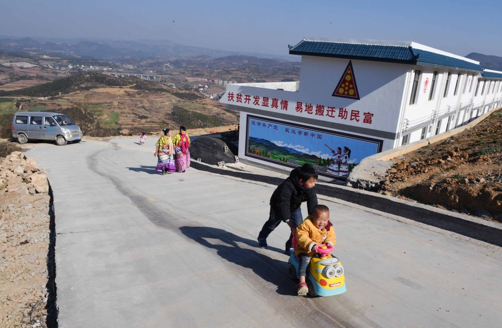 在云南省寻甸回族彝族自治县河口镇窑湾子村,两名儿童在混凝土硬化路上玩耍(2018年2月20日摄)。新华社记者 杨宗友 摄