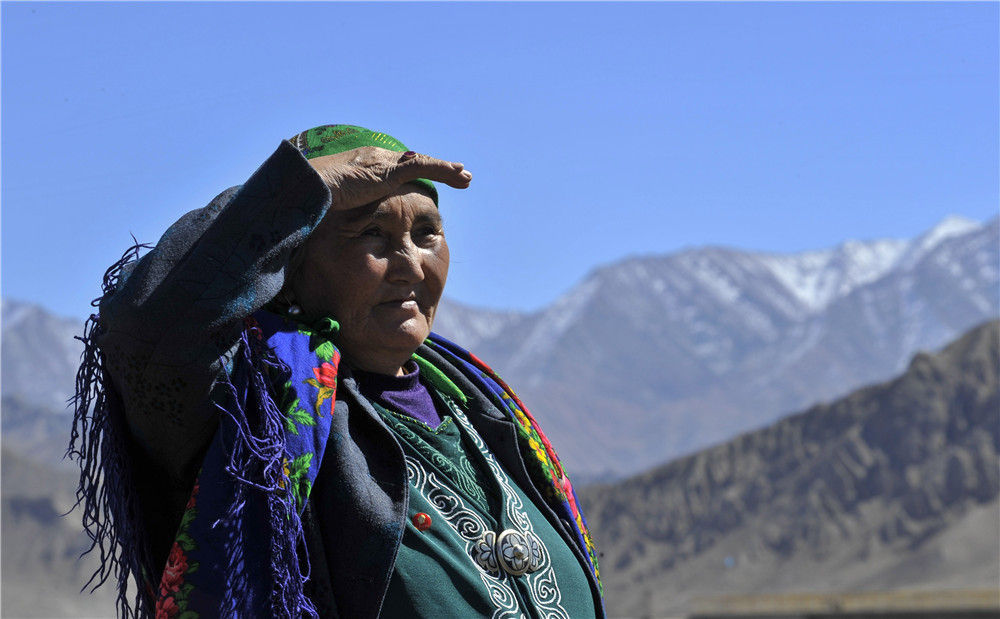 在新疆乌恰县吉根乡,布茹玛汗·毛勒朵遥望边境线上的雪山(2012年10月1日摄)。新华社记者 江文耀 摄