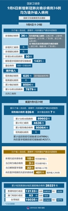 截至9月6日24时,据31个省(自治区、直辖市)和新疆生产建设兵团报告,现有确诊病例826例(其中重症病例7例),累计治愈出院病例89602例,累计死亡病例4636例,累计报告确诊病例95064例,无现有疑似病例。累计追踪到密切接触者1167006人,尚在医学观察的密切接触者14217人。