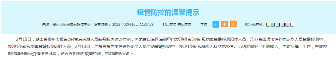 2月16日,贵州省卫生健康委发布最新疫情防控温馨提示,具体如下: