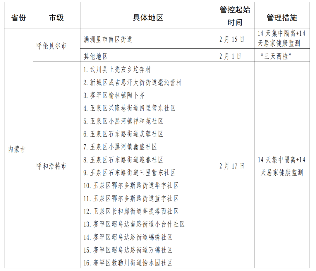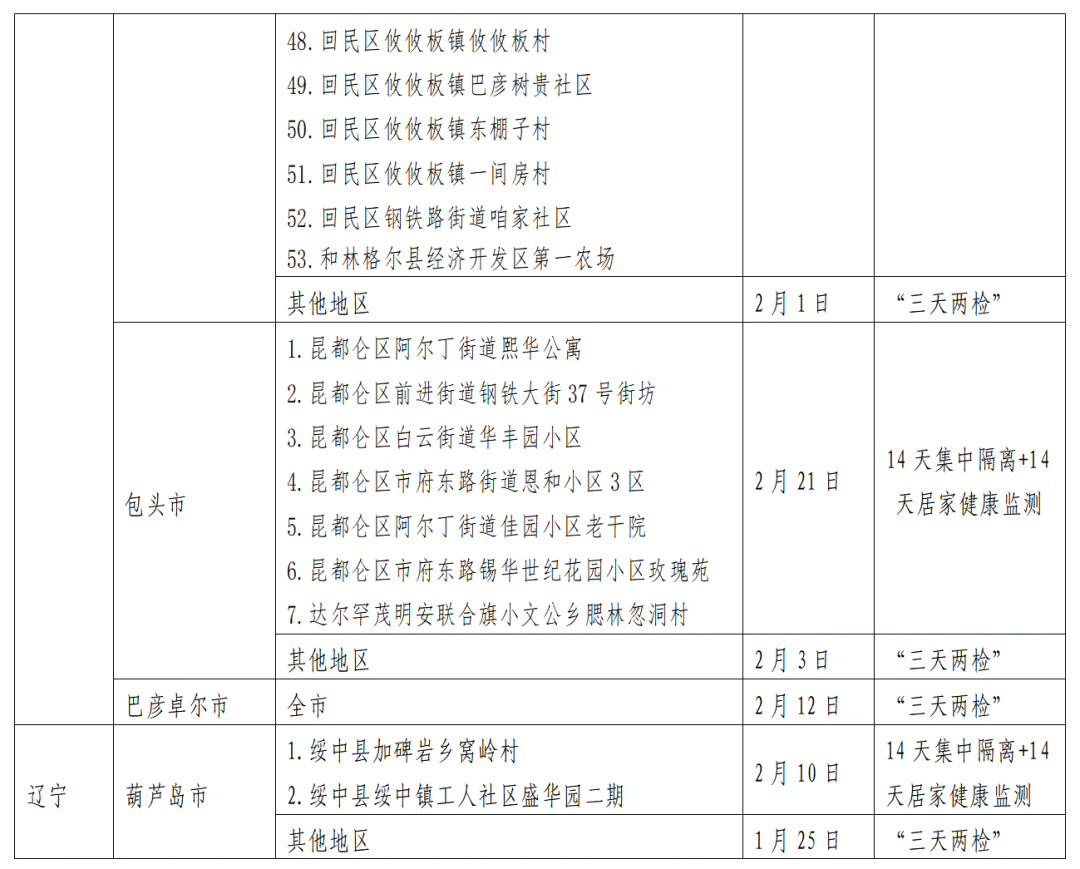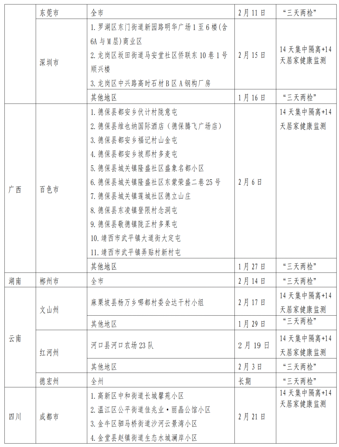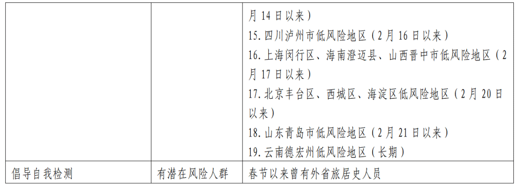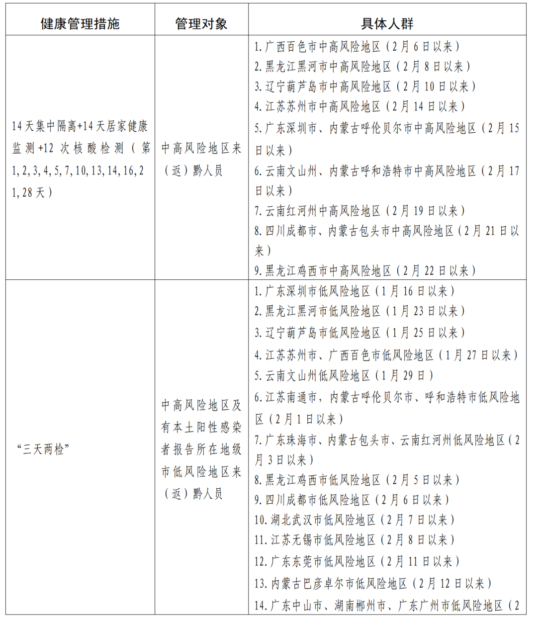 二、自2月21日起,从湖北省、北京市、山东省疫情当前及后续公布的中高风险地区来返黔人员,严格执行“14天集中隔离+14天居家健康监测+12次核酸检测”的防控措施;2月7日以来有湖北省武汉市旅居史,2月20日以来有北京市西城区、丰台区、海淀区旅居史,2月21日以来有山东省青岛市旅居史,或其他有阳性感染者报告的地级市(其中的低风险地区)来返黔人员,须持有48小时内核酸检测阴性证明且健康码为“绿码”,抵黔后分类落实“三天两检”措施。以上防控措施将根据当地疫情形势适时调整。