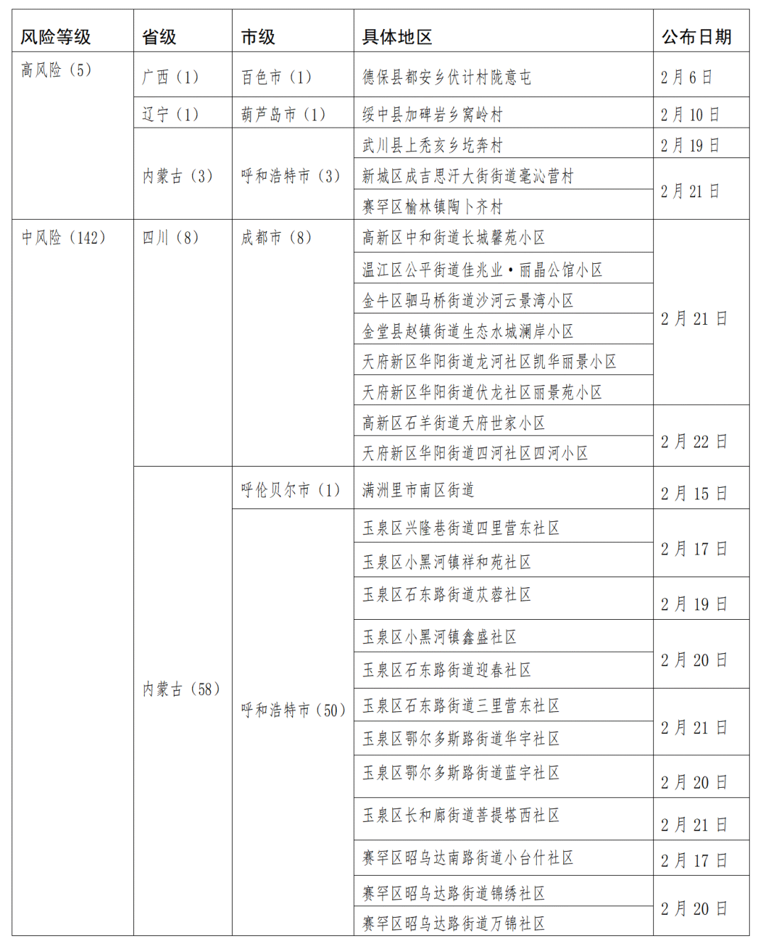 四、当前国内部分地区疫情形势仍然严峻复杂,请广大群众密切关注国内疫情动态,坚持不前往中高风险地区及所在县(市、区、旗),非必要不前往中高风险地区所在地级市的其他县(市、区、旗);如确需出行,请通过微信/百度/支付宝搜索“国务院客户端”小程序,提前查询目的地疫情防控政策措施并严格执行。日常需坚持科学佩戴口罩、勤洗手、常通风、保持安全社交距离等良好生活习惯不松懈,切实增强个人防护意识,出现发热、干咳、乏力、嗅(味)觉减退等新冠肺炎疑似症状后第一时间进行报告、就诊、自我隔离。