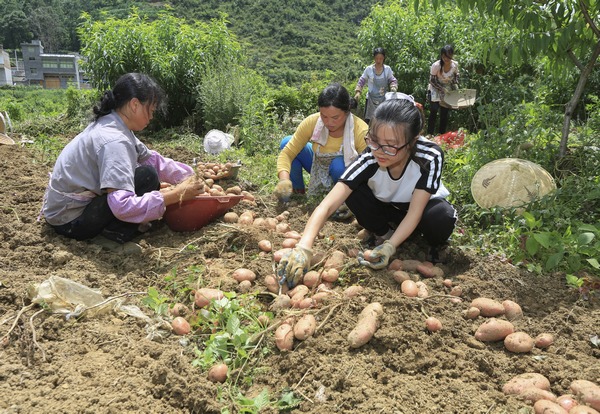紫云自治县猫营镇长兴村“第一书记”姜莹(右一)带领村民在精品水果基地套种马铃薯,以短养长。图为该村马铃薯丰收。安顺市委宣传部供图