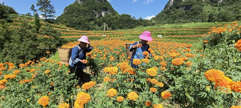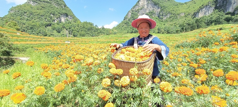 “一季万寿菊要采摘十多茬,菊花亩产量6000斤以上,菊花发酵后销售给医药生产商提取黄色素。”格凸河镇党委委员王君珺说,万寿菊让农户得到土地流转费和就近务工两笔收入,稳定增收。同时,万寿菊花期长,能吸引游客前来观光赏景,带动旅游经济的发展助力乡村振兴。