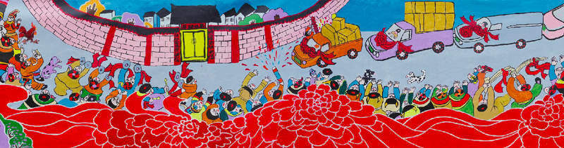 画师杨慧主要负责的版块为“搬新家”。“几年前,我在大方县奢香古镇易地扶贫搬迁安置点,恰好遇见一批彝族、苗族同胞们敲锣打鼓、欢欢喜喜搬进新房。”杨慧将记忆里的场景都绘成了画,她还特地在画面下方加上红色的花朵与飞扬的丝绸带子,“他们现在的生活,不就是红红火火的么。”