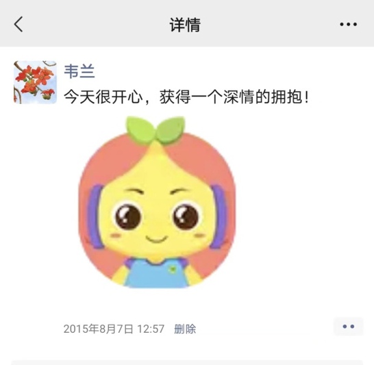 2015年8月7日,韦兰在微信朋友圈发了一条信息:今天很开心,获得了一个深情的拥抱!“那一刻,我非常非常激动。”说着话,韦兰拿出手机向记者展示了那条信息。