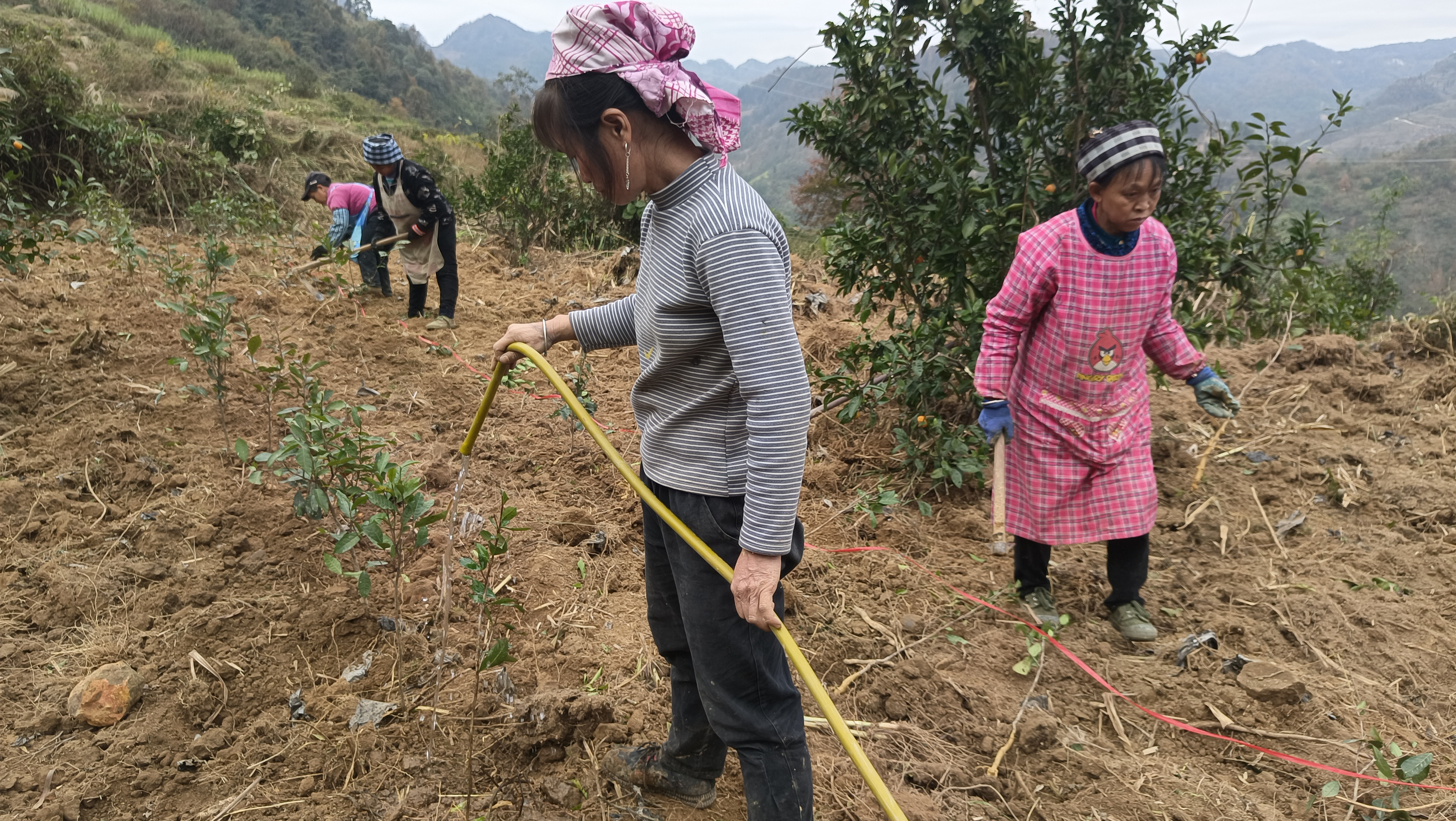 12月16日,紫云自治县大营镇打洼坪村围城组后山坡上,数十名村民在翻地、打窝、栽苗、浇水……忙碌的种植着紫茶苗。