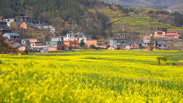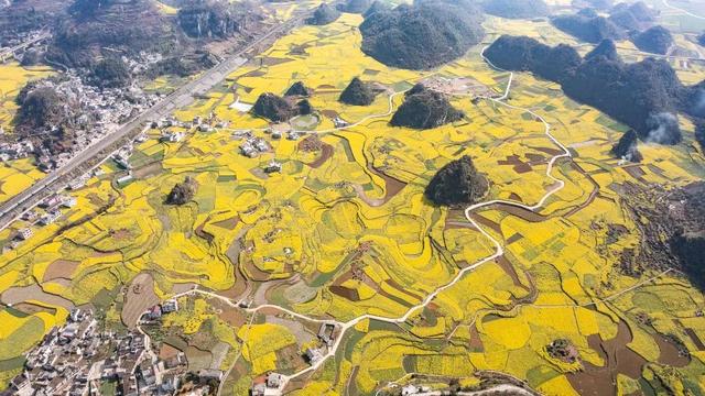春暖花开时,贵州省六盘水市六枝特区木岗镇的16000余亩油菜花竞相绽放,与田地、民居、道路构成了美丽的春日画卷。