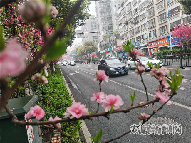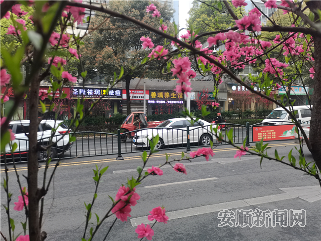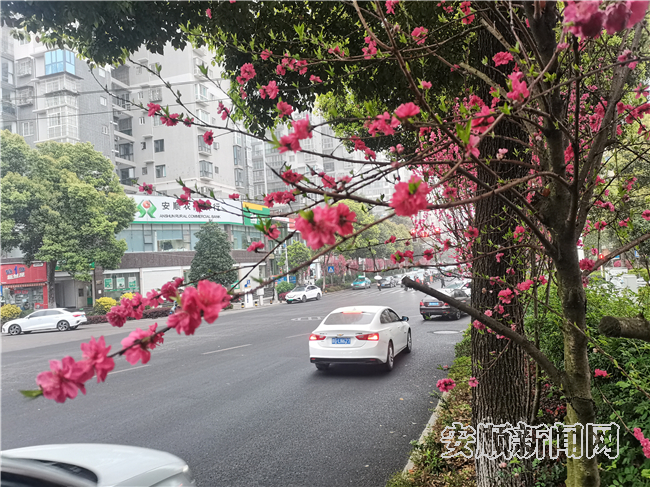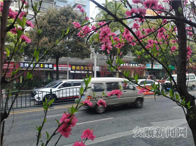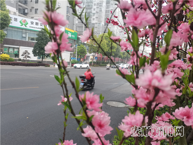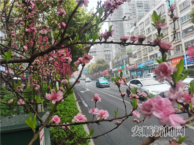 3月28日,市区黄果树大街、龙青路、永丰大道等主干道两旁的桃花、千叶桃花等相继开放,成为市区街头一道亮丽的景观,红色的花瓣、绿色的树叶带来了春天的勃勃生机,也给市民带来了春的气息。