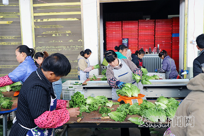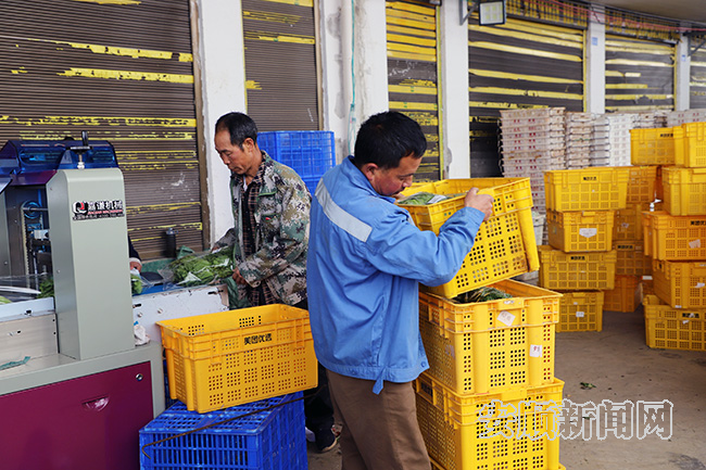 4月25日,记者来到普定县白岩镇中心社区,在贵州爱闯农业机械有限公司的蔬菜生产车间看到,工人们正有条不紊地分工合作,将刚刚从蔬菜基地运来的新鲜蔬菜经过分拣、称重、包装、装箱等程序,然后搬运上货车,通过美团优选线上平台销往我市各个地方。