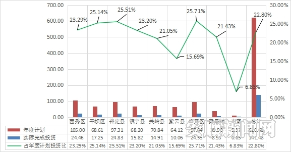 分县区,完成投资占年度计划投资比前三位的是经开区、普定县、平坝区,分别为25.71%、25.51%、25.14%。
