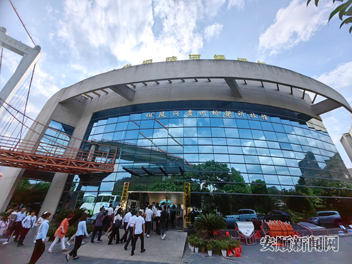坝陵河大桥是“国内第一、世界第六”的大跨径钢桁梁悬索桥,是贵州唯一一座可以进入桥体内部参观的大桥,开设了低空跳伞、蹦极等供游客体验的项目。参访团一行来到科技馆3楼观景台眺望雄伟壮丽的坝陵河大桥,现场观看了高山峡谷之上的大桥蹦极、高空秋千等表演。