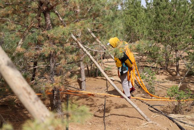 这是2023年5月31日,治沙工人在库布其沙漠亿利生态治理区内搬运水管,准备为树木浇水。新华社记者 王楷焱 摄