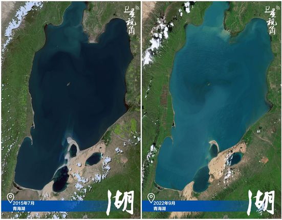 ↑2022年跟2015年相比,从卫星图上下部分看青海湖水体面积扩大。
