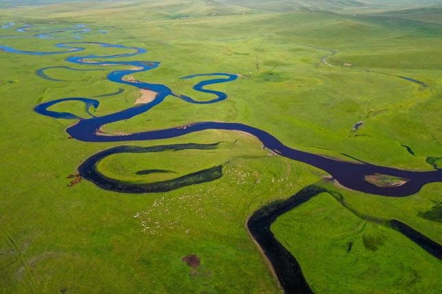 这是位于内蒙古呼伦贝尔市陈巴尔虎旗境内的莫日格勒河(2021年7月21日摄,无人机照片)。新华社记者 连振 摄