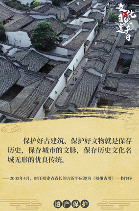一直以来,习近平高度重视中华优秀文化和自然遗产的保护工作,为《福州古厝》作序、保护三坊七巷、多次踏访历史文化古迹,强调历史文化遗产的保护与传承。