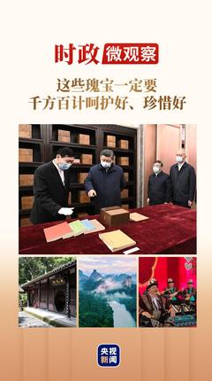 从文化遗产的传承到自然遗产的保护,从加强物质文化遗产的保护利用到激发非物质文化遗产的创新活力……总书记从留住文化根脉、守住民族之魂的战略高度,关心和推动文化和自然遗产保护工作。