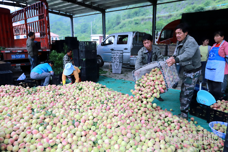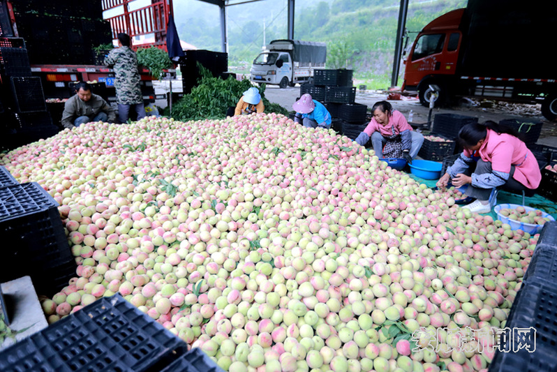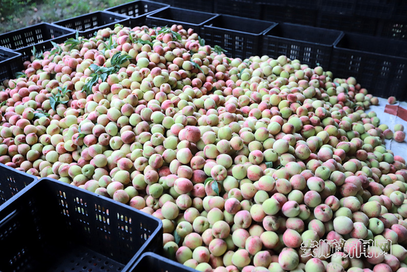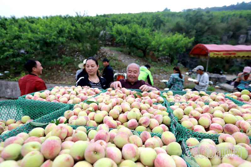 走进普定县夜郎湖畔的万亩梭筛桃种植基地,枝繁叶茂的桃树上结满桃子,阵阵桃香扑鼻而来。