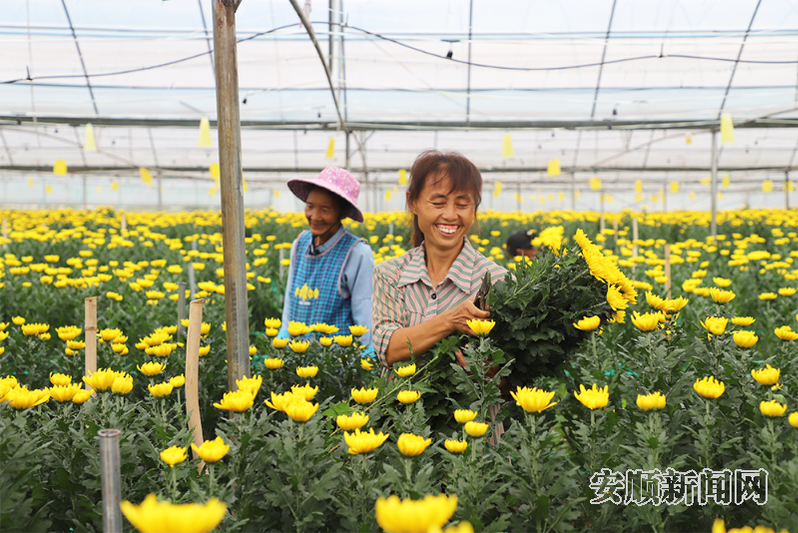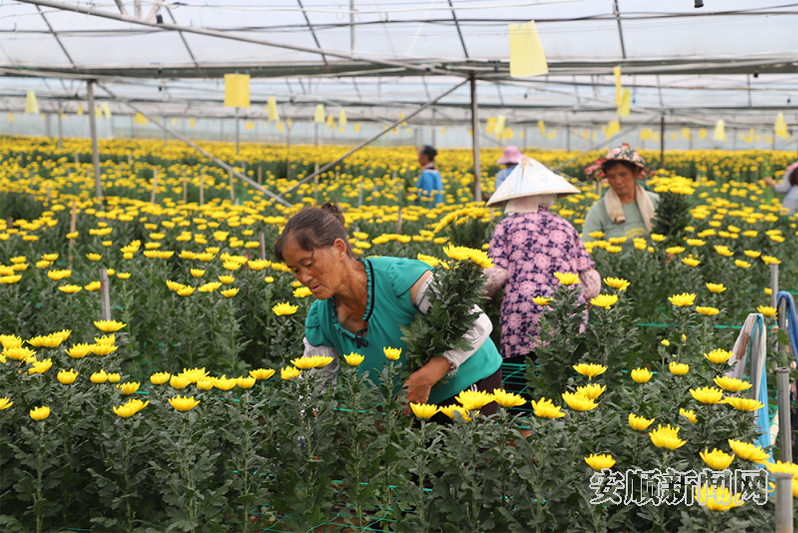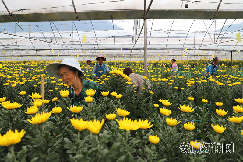 近日,记者来到镇宁自治县马厂镇小河村的贵州欣悦众鑫花卉(集团)有限公司菊花种植基地,只见大棚中一株株金黄的菊花簇拥盛开,亭亭玉立,远远望去宛如金色的海洋,十余名工人正穿梭在花丛中抓紧时节采摘菊花。