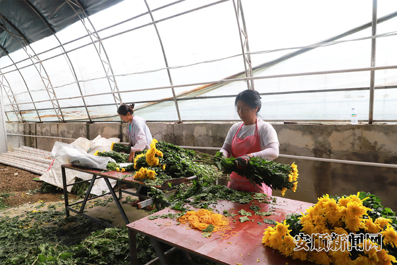 谈及为何在镇宁发展菊花种植产业,罗太芳打开了话匣子:“随着近年来大力推进移风易俗,提倡文明祭祀,人们的思想观念和生活方式发生很大转变,鲜花越来越成为人们生活中的刚需,市场前景非常广阔,再加上镇宁的气候条件非常适宜菊花种植,交通也非常便利,利用脱贫攻坚阶段建设起来的闲置大棚可以降低前期投入成本。”