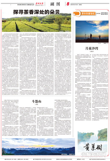 朵贝下来十婆婆,转转弯弯墨香河,草鞋出在下水母,熬糖出在陆家坡,播咱寨,赶香买……这是我小时候听到过的民谣,它反映了那时我所居住故乡农民所依托的主要经济来源,我想,就像紧挨朵贝村的我的小村庄——播咱寨。20世纪80年代,主要的经济来源就是赶香卖,那一柱柱纤弱的祭祀用的“香”,曾经是家里柴米油盐以及孩子读书的经济支柱,曾经照亮了那时村民苦涩的琐碎日常,朵贝茶也是一样的,在旧年的岁月,以家庭为单位,他们赶在初春的季节,摘取自家地埂上的片片嫩叶,制作成“茶叶”赶赴每一个乡场,那春风里的嫩,曾经温暖了那些“母亲和父亲”的内心,曾经喜悦了那些天真烂漫的孩童。在清风摇曳里,我们坐在哗哗流水的墨香河边,细品清黄的朵贝茶,芳香四溢,那香气和流水,洗净了满身尘埃,山里的鸟鸣和野草,柔软了心灵。于是,一个故事这样在文友中荡漾开来:一个朵贝姑娘,爱上了一个年轻俊美的外省小伙,他们的相爱,如朵贝茶的香,淡淡温暖。日子在平静幸福中度过,后来,小伙身患重症,不久就会离开人世。姑娘就带着小伙来到了生她养她的朵贝,他们想温柔安静度过两人在一起的最后的时光,每天他们泡茶采茶育茶,在窄口水库里看白鹭飞翔,洗净满身尘埃;还在朵贝千年古朴树下看月亮升起又落下,慢慢地,小伙子越来越精神。后来,他们共同孕育了他们爱的结晶——一个可爱的姑娘和一个俊美的儿子,日子就这样度过了许多时光,姑娘的每一个微笑和皱眉小伙都知晓其中的内容,而在琐碎的日常里,他们从来不会厌倦,彼此温柔相待,心意相通。在一个晚霞轻柔大地的日子,朵贝姑娘睡着后就再也没有醒来,不久后,小伙梦见了朵贝姑娘携带一杯可以看得见香味的朵贝茶倾倒在大黑山的山坳间,小伙仰着头,伸出双手微笑着进入了另一个梦乡……