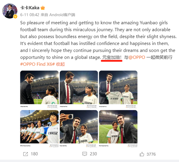 微博(译文):“很高兴在这段神奇的旅程中见到并了解了令人惊叹的元宝女子足球队。她们不仅可爱,而且在球场上拥有无限的能量,尽管她们有点害羞。很明显,足球给她们灌输了信心和幸福,我真诚地希望她们继续追求自己的梦想,并很快有机会在全球舞台上大放异彩。元宝加油!”