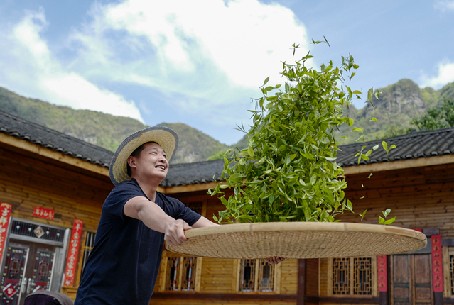 2023年4月19日,重庆市南川区德隆镇茶树村一个居民点,制茶工艺传承人在帮助村民翻晒新鲜茶叶。